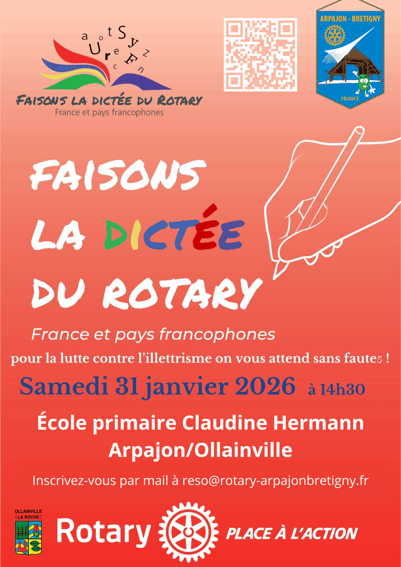 Envie de tester votre orthographe ❓Rejoignez nous pour La Dictée du Rotary ✍️🇫🇷Un rendez-vous national et francophone pour dire STOP à l’illettrisme ! 📅 Samedi 31 janvier 2026 – 14h30📍
