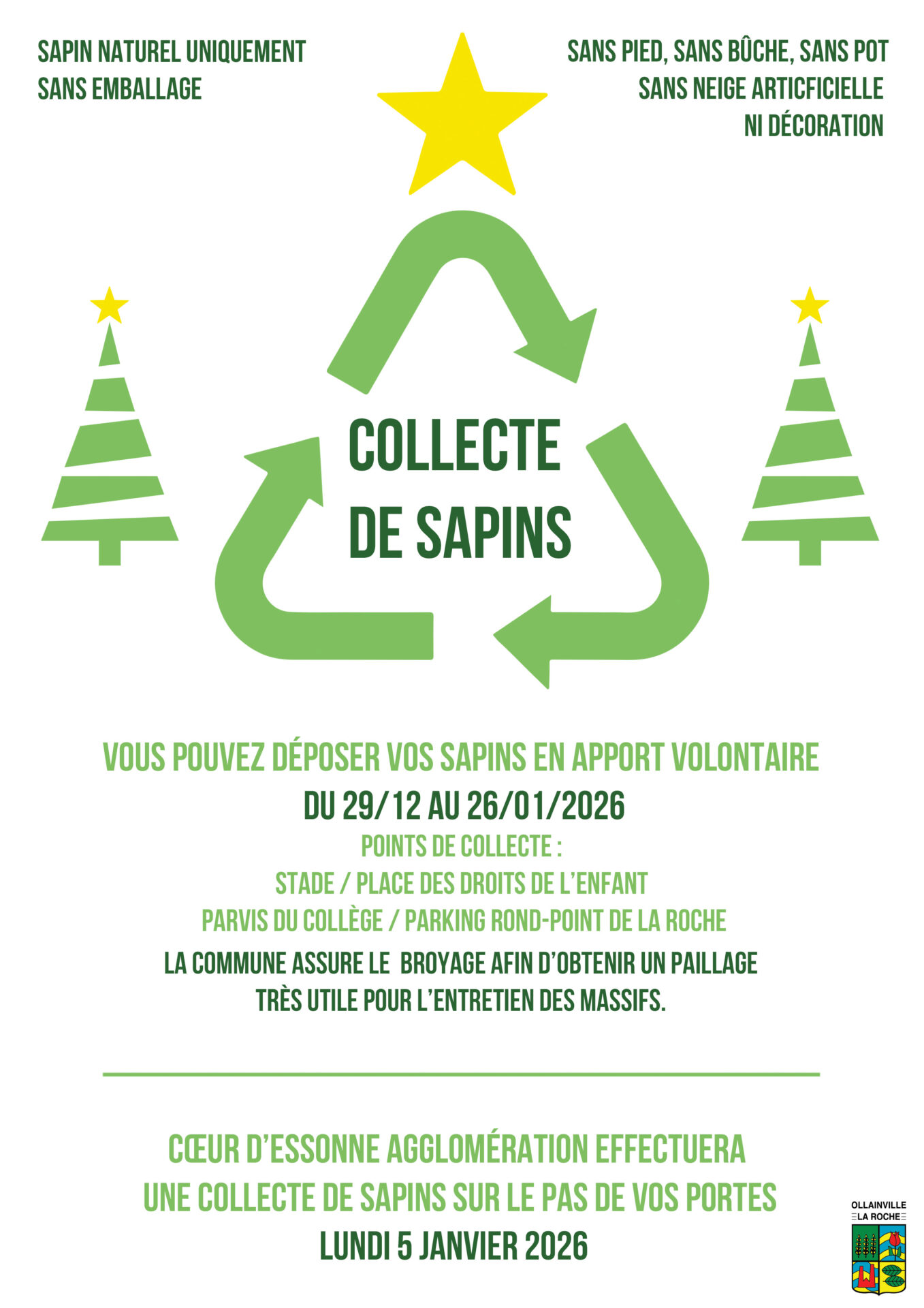 Collecte de sapins de Noël Après les fêtes, donnez une seconde vie à votre sapin ! Déposez-le sans pied, sans pot, sans décoration ni neige artificielle dans les points de -
