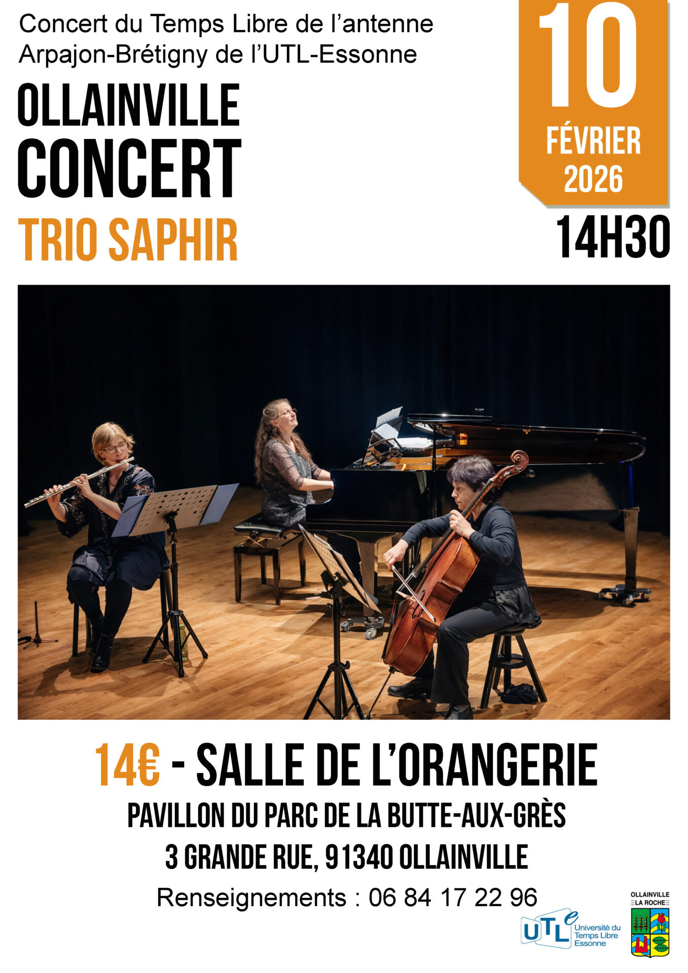 Concert du Temps Libre de l’antenne Arpajon-Brétigny de l’UTL-Essonne Concert Trio Saphir à Ollainville Mardi 10 février 2026 à 14h30 Salle de l’Orangerie – Pavillon du Parc de la Butte-aux-Grès,