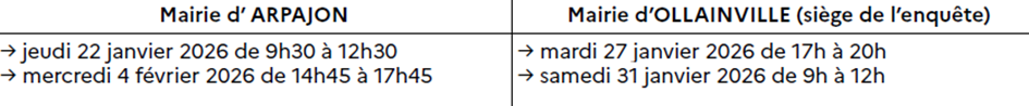 Il sera procédé du lundi 19 janvier 2026 au jeudi 5 février 2026 inclus, soit 18 jours, à l’enquête parcellaire complémentaire préalable à la cessibilité des emprises nécessaires à la réalisation du projet d’aménagement de la ZAC des Belles Vues sur le territoire des communes d’Arpajon et d’Ollainville.