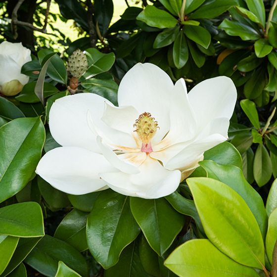 Le Magnolia à grandes fleurs peut dépasser 25 m de hauteur et vivre plus d’un siècle. Dans certains parcs anciens, il forme des scènes impressionnantes au moment de la floraison. Ses feuilles épaisses et persistantes, tombant en continu, expliquent pourquoi on l’aperçoit souvent dans de vastes pelouses plutôt que dans de petits jardins.